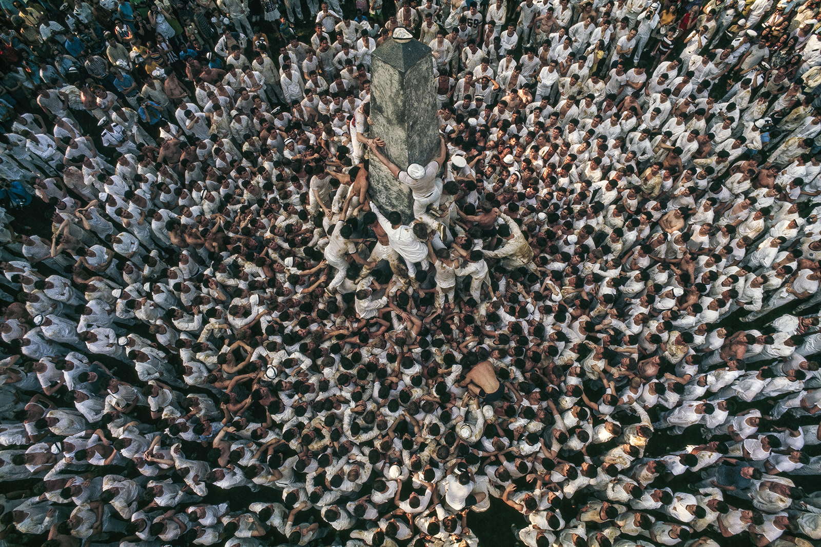 Celebrating the end of their first year, Naval Accademy plebes engulf the Herndon Monument to knock off a cap and replace it with one of their own.