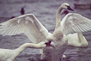 A peckish squabble doesn’t amount to much between tundra swans that have flown together across the continent from Arctic nesting grounds.